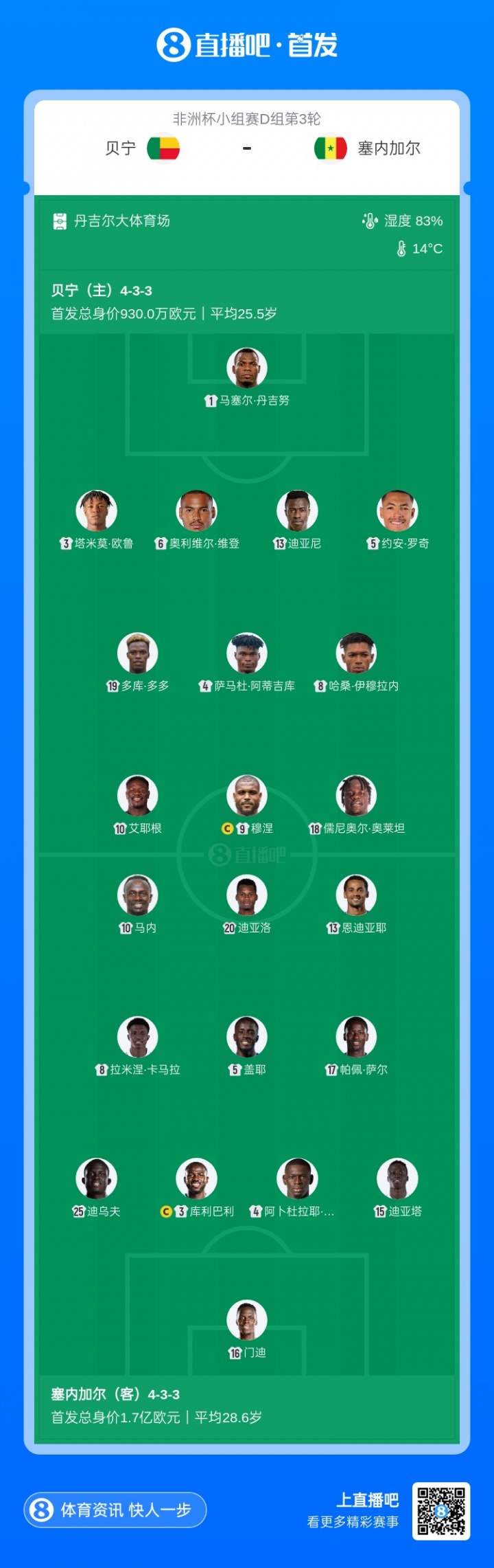 12月31日讯 北京时间12月31日3:00,非洲杯小组赛D组末轮,贝宁vs塞内加尔。赛前双方公布了本场比赛的首发名单。